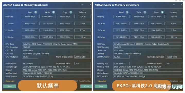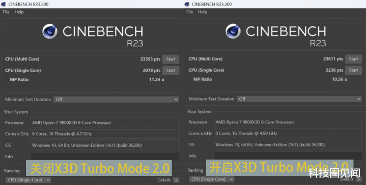 然而,该主板最核心的竞争力,在于其专为X3D处理器深度优化的X3D Turbo Mode 2.0技术。这项功能可通过BIOS一键开启,其原理在于通过专用硬件模块与AI算法,动态调节处理器的频率与电压策略,并协同优化内存子系统。在我们的性能测试中,这项技术展现出了明确的价值。在CINEBENCH R23、CPU-Z及V-Ray Benchmark等基准测试中,开启X3D Turbo Mode 2.0后,AMD Ryzen 7 9800X3D处理器的单核与多核性能均获得可量化的提升,其中单线程性能提升尤为显著,这对依赖于高频率响应的大量应用场景至关重要。